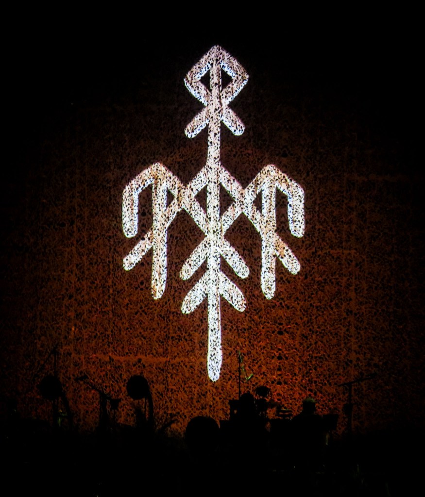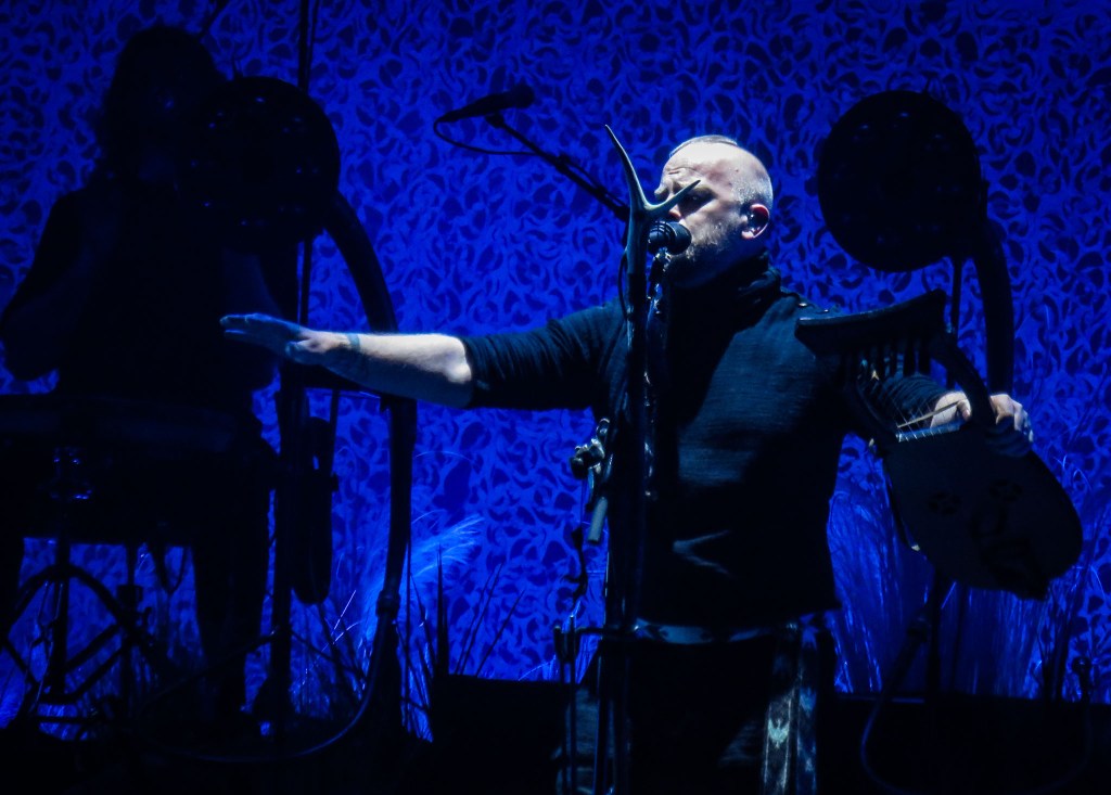 The stage was set up as it has been on recent tours with white netting draped down the back of the stage, and across the wings serving as a backdrop for images and shadows to be projected onto later on, but to start with, the Wardruna logo was proudly and boldly on display. There were a variety of instruments strategically positioned on the stage ready for use, as well as a lot of foliage giving the image of this set being performed ‘in nature” rather than in a sleek modern building.