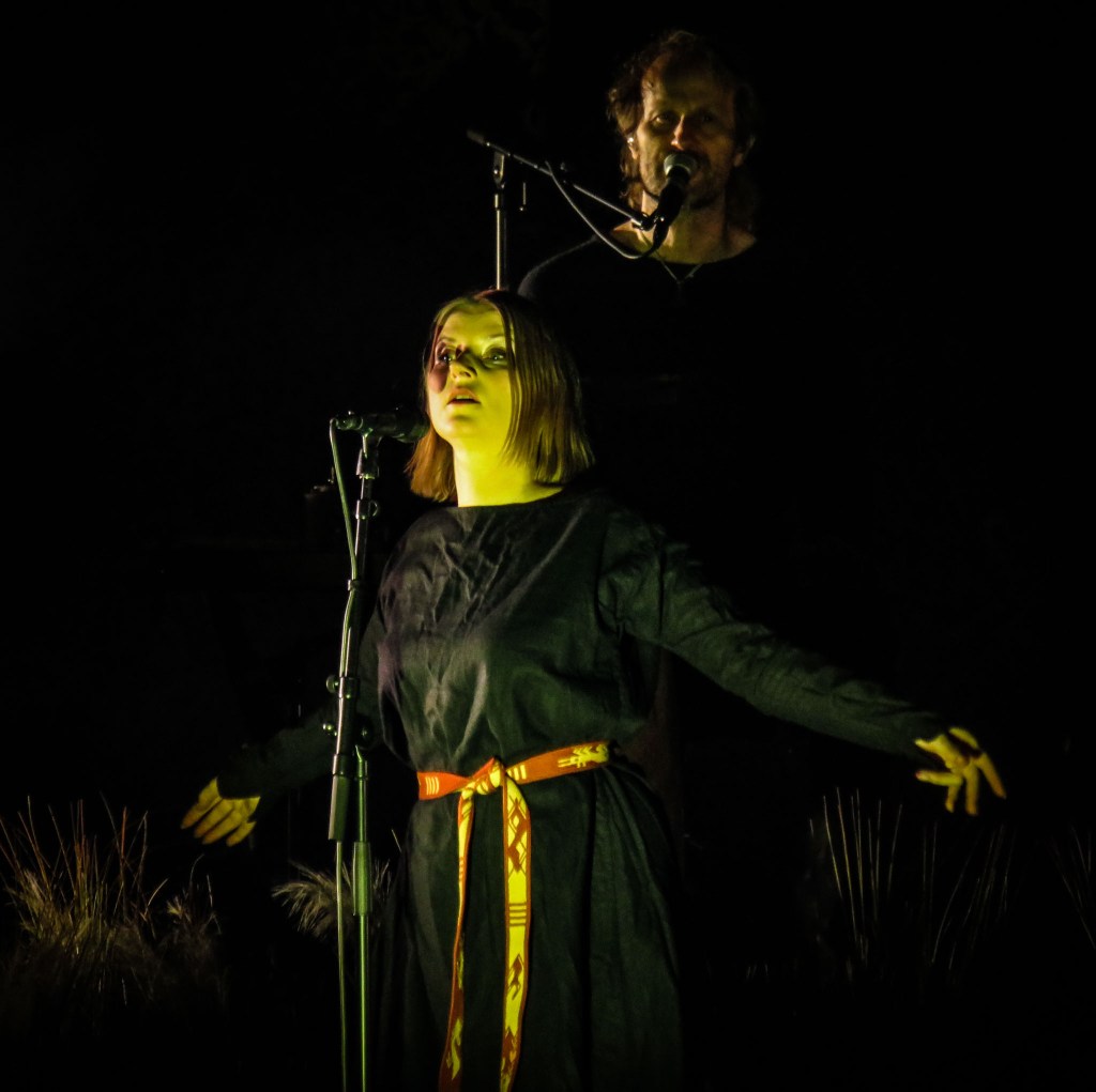 The lights went down and the band were greeted to the stage by a polite, but enthusiastic, round of applause as the familiar introduction to ‘Kvitravn’ was played, with images of a white raven being projected on the back to the stage. Initially the bass and Einar’s vocals overpowered the rest of the sound as they resonated around the venue, but this was quickly rectified leaving a perfect sound. ‘Hertan’, from the latest album, followed, with the hypnotic percussion sounding like a heart beating, combining perfectly with Lindy-Fay Hellas enchanting vocals. The sombre tomes of ‘Skugge’ followed, with the track bursting to life half way through. Einar’s vocals were powerful and impassioned. Birds tweeting heralded the arrival of ‘Solringen’ with its upbeat meoldy, with Einar and Lindy-Fay combining perfectly with their complementary vocal styles.