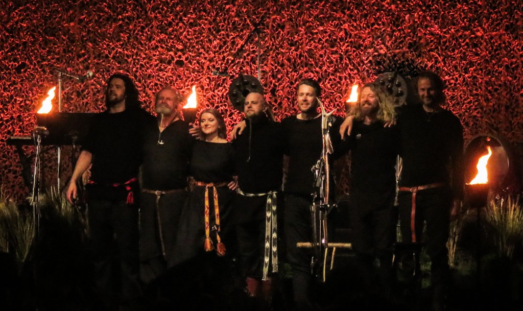 The atmosphere was more subdued for the sublime, subtle melodies of ‘Fehu’ before a brief pause in proceeding where Einar addressed the crowd. However, before he had chance to say anything, the crowd was on their feet giving a standing ovation. Once the crowd settled, Einar gave the same reflections that he always does at this point, musing that the band is not about time travel, or trying to be vikings, nor about one culture being better than another. He also considered that some things from the past are better left in the past, while others should be cherished, preserved and even rekindled, such a singing. He goes on to say that there used to be songs for all aspects of life including death, and laments the loss of this. Of course this led into ‘Helvegen’, which was introduced as a song about death and dying, a song about remembering and honouring someone and singing them to the other side and letting go.